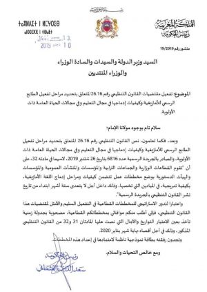 اختار السيد رئيس الحكومة اليوم العالمي لحقوق الإنسان، 10 دجنبر، ليصدر منشورا رقم 19/2019 يدعوا فيه وزراء حكومته لايفائه بمخطط كل قطاع في سبل تنزيل مضامين القانون التنظيمي المتعلق بتفعيل الطابع الرسمي للأمازيغية، كما ينص على ذلك القانون التنظيمي نفسه الصادر في الجريدة الرسمية شهر شتنبر 2019.