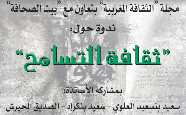 في سياق الأفق الجديد الذي تعمل مجلة «الثقافة المغربية» على تكريسه، كاستراتيجية ثقافية جديدة، تستجيب لمتطلبات المرحلة الراهنة، بما تعرفه من متغَيِّرات، في مختلف مجالات المعرفة والفن، وحقول الإبداع، ستعمل المجلة، تحت إشراف وزارة الثقافة والاتصال ـ)قطاع الثقافة(، وبالتعاون مع مؤسسات ذات علاقة بالشأن الثقافي والفني والتربوي والإعلامي، على تنظيم ندواتٍ، في مختلف جهات المغرب، من بين ما تقترحه من ملفات ثقافية، يتم نشرها في أعداد المجلة. وستعمل المجلة، في هذا السياق، على تنظيم ندوة حول «ثقافة التسامُح»، تحت إشراف وزارة الثقافة والاتصال ـ قطاع الثقافة، وبتعاون مع بيت الصحافة بمدينة طنجة، وذلك يوم الجمعة 25 ماي 2018، على الساعة التاسعة مساء، بمشاركة الأساتذة: سعيد بنسعيد العلوي ـ سعيد بنكراد ـ والصّدِّيق الحيرش، ويدير الندوة، صلاح بوسريف.