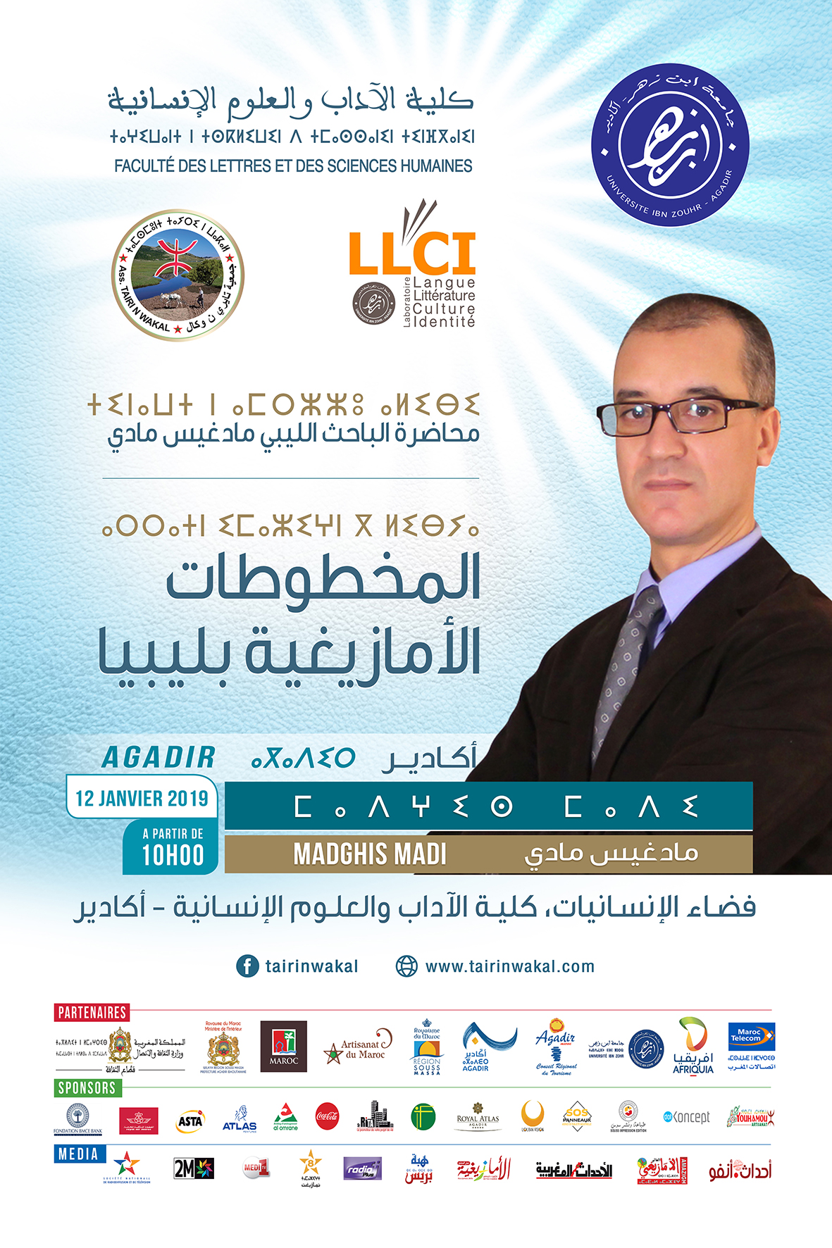 نتشرف بدعوتكم لحضور محاضرة الباحث الليبي مادغيس مادي في موضوع “المخطوطات الأمازيغية بيليبيا”، يوم السبت 12 يناير 2019 على الساعة 10 صباحا بفضاء لانسانسيات بكلية الاداب والعلوم الانسانية بأكادير.