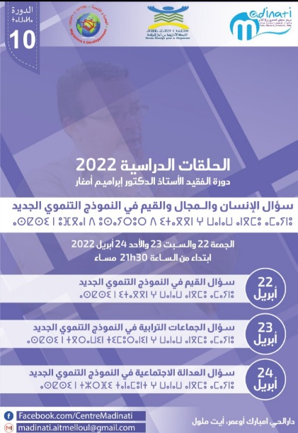 ينظم مركز مدينتي للتكوين والإعلام، بشراكة مع كل من منظمة هجرة وتنمية والشبكة الأمازيغية من أجل المواطنة، الدورة العاشرة من الحلقات الدراسية، دورة الفقيد الأستاذ الدكتور إبراهيم أمغار، في موضوع:
