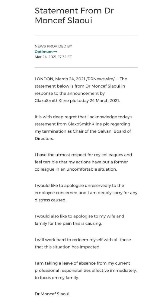 وأضاف السلاوي “إنه لمن دواعي الأسف الشديد أن أقر ببيان اليوم الصادر عن شركة GlaxoSmithKline plc بشأن إنهاء عملي كرئيس لمجلس إدارة شركة Galvani”.