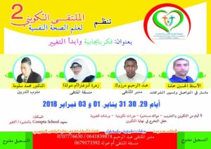 تحت عنوان : “فكر بايجابية وابدأ التغيير” تنظم الجمعية المغربية للتدريب والاستشارات الملتقى التكويني 2 لعلم الصحة النفسية من 30 يناير الى 3 فبراير 2018 على مدى 5 أيام بمعهد كونتا سكول بمدينة الدشيرة