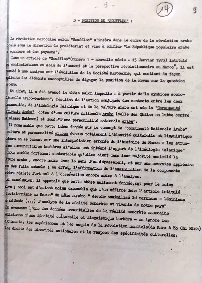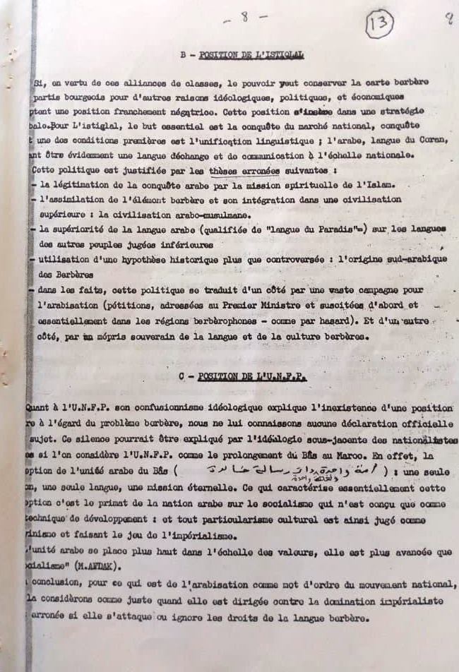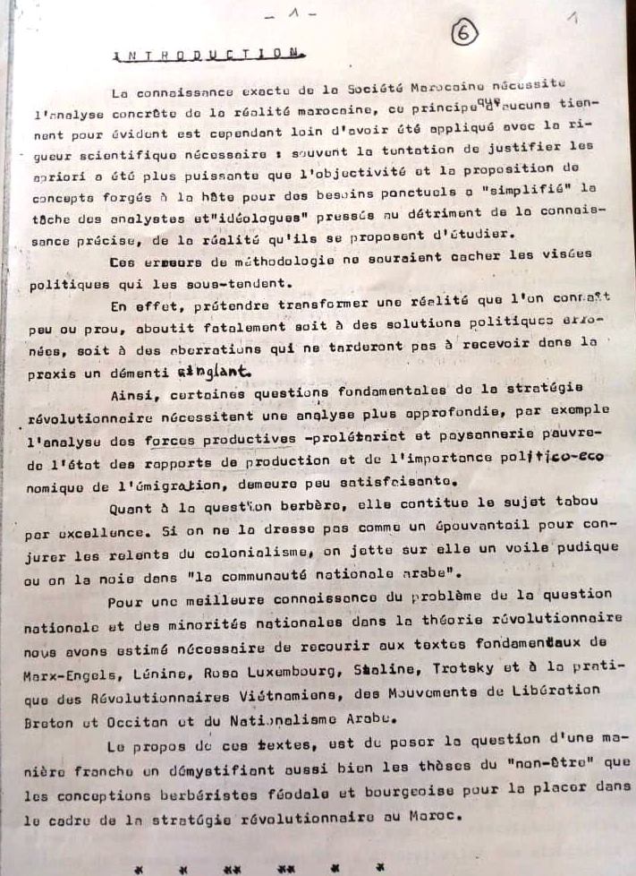 استجابة لطلب بعض الأصدقاء والصديقات الافتراضيين (virtuelLEs) والواقعيين في استكمال معرفة تصور الرعيل الأول من الأساتذة والباحثين؛ في تلك الفترة العصيبة؛ لما كانت عليه اللغة والثقافة الأمازيغيتين وما ينبغي أن تكونا عليه؛ ستُخَصَّصُ هذه الحلقة والتي تليها لعرض باقي مكونات “الوثيقة-البيان”؛ الموجه آنذاك لليسار المتطرف في “دار المغرب” بباريس من أجل فتح نقاش حول المسألة الأمازيغية؛ خاصة وأنها تستعرض وجهة نظر مختلف التيارات الإيديولوجية والفكرية والسياسية والثقافية آنذاك.