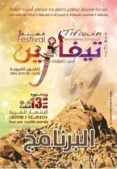 ينطلق في 15 غشت 2018 بتافراوت مهرجان تيفاوين للفنون القروية في دورته 13 تحت شعار: ” الاشهار للقرية” وهو من تنظيم جمعية فستفال تيفاوين بشراكة مع جماعتي أملن و تفراوت ويدوم الى غاية 19 غشت وللحديث على هذه التظاهرة عقدت الجمعية ندوة صحفية يوم الخميس 9 غشت بقاعة الاجتماعات لغرفة التجارة والصناعة والخدمات باكادير كشفت فيها عن برنامج الدورة واهم الانشطة المقامة على هامشها وفيما يلي البرنامج العام للدورة 13 :
