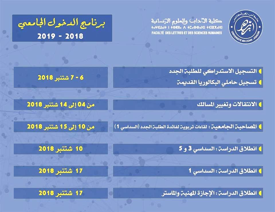 مواعيد انطلاق الموسم الجامعي 2018-2019 بكلية الآداب والعلوم الإنسانية بجامعة ابن زهر.