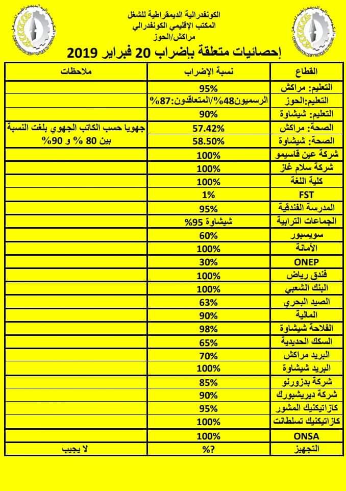 نتائج الاضراب العام ليوم الاربعاء 20 فبراير 2019 بجهة مراكش