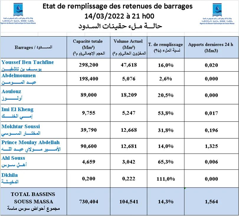 نسبة حقينة السدود بجهة سوس بعد التساقطات المطرية ليوم امس