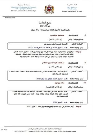 وذكرت المديرية أن رياح قوية (من 75 إلى 85 كلم/ساعة)، من المنتظر أن تهم يوم الأحد كل من الحوز، الحسيمة، أزيلال، بني ملال، بولمان، شفشاون، شيشاوة، الرشيدية، الصويرة، فكيك، كرسيف، إفران، جرادة، خنيفرة، ميدلت، ورززات، وجدة-أنجاد، آسفي، تاوريرت، تازة، تنغير، اليوسفية وزاكورة.