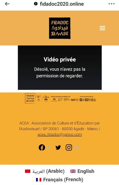 ومن خلال تتبعنا لأخبار النسخة الرقمية للمهرجان دون أن نتمكن من مشاهدة الأفلام المعروضة لأنها كانت خاصة privé ، و الدعاية التي نشرها المنظمون تقول يمكن مشاهدة الافلام مجانا وعلى الانترنيت طوال اليوم في جميع أنحاء المغرب وافريقا انطر،- الصورة الاولى- ، و لما تسعى لمشاهدة احدى هذه الأقلام خاصة ان بعضها مصور باكادير وحول قضايا مهمة مثل شريط – أمهات – ، تصتدم بصورة أخرى تقول أن الفيديو خاص – أنظر الصورة الثانية – مما يطرح سؤالا هل هذا المهرجان عمومي أم خاص ؟