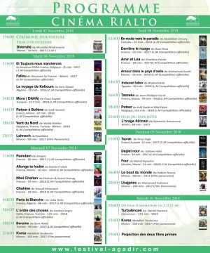 هذا هو برنامج الدورة 15 للمهرجان الدولي للسينما والهجرة الذي سيكرم عدة فعاليات سينمائية من بينها الحسين بردواز والممثل عزيز داداس عن فيلمه الجديد “لحنش” الذي سيعرض باكادير لاول مرة.للاشارة فضيفة الشرف هذه السنة هي دولة البنين .للتذكير فالمهرجان من تنظيم جمعية مبادراة ثقافية التي يرأسها ادريس مبارك ويقام هذه السنة من 5 الى 10 نونبر2018 بقاعة سينما ريالطو باكادير في غياب قاعات سينمائية تليق بالتظاهرة وهي النقطة كانت من توصيات الجمعية كل دورة لكن الامور لازالت على ماهي عليه مع الاسف.
