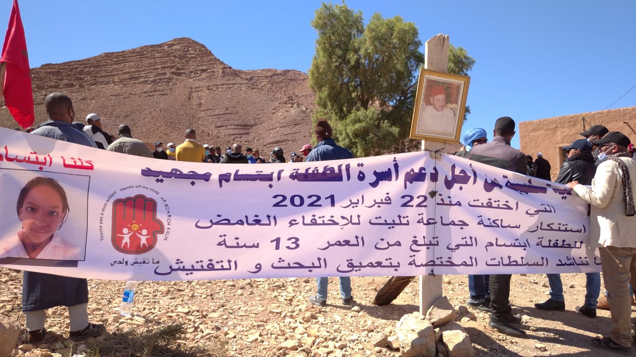 ورفع المحتجون وبينهم عدد من النساء شعارات تطالب السلطات المختصة بالبحث عن الطفلة البالغة من 13 سنة والتي اختفت مند 22 فبرار الماضي.