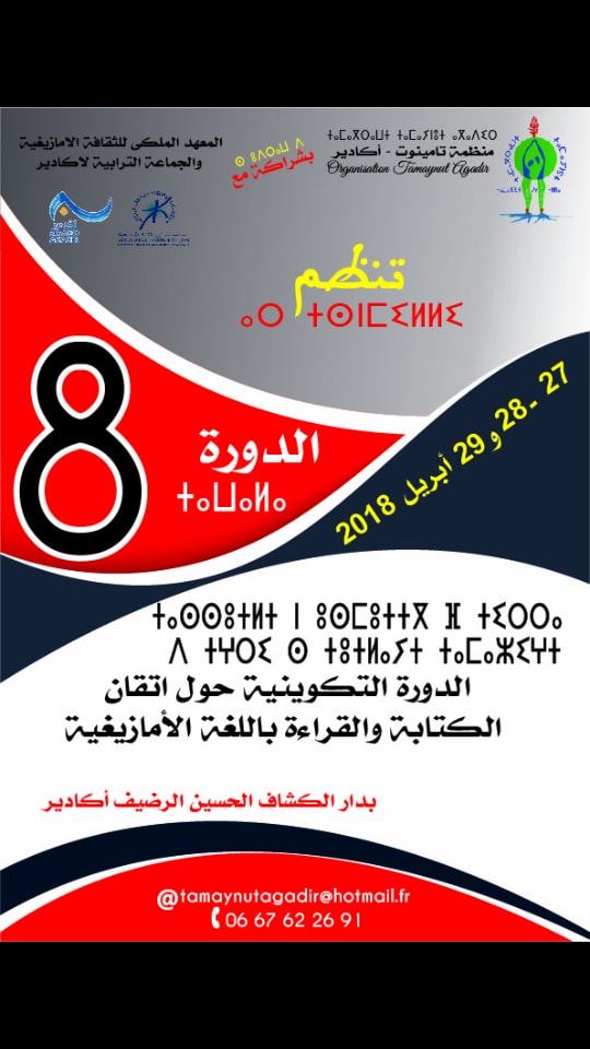 بشراكة مع المعهد الملكي للثقافة الامازيغية منظمة تاماينوت اكادير تنظم دورة تكوينية حول: “اتقان الكتابة والقراءة باللغة الامازيغية” ايام 27 و28 و29 ابريل 2018 بأكادير. لفائدة اعضاء الجمعيات والنوادي الثقافية والفنانين والمبدعين ورجال الاعلام بجهة سوس ماسة. للمشاركة والتسجيل يرجى الاتصال بالارقام :