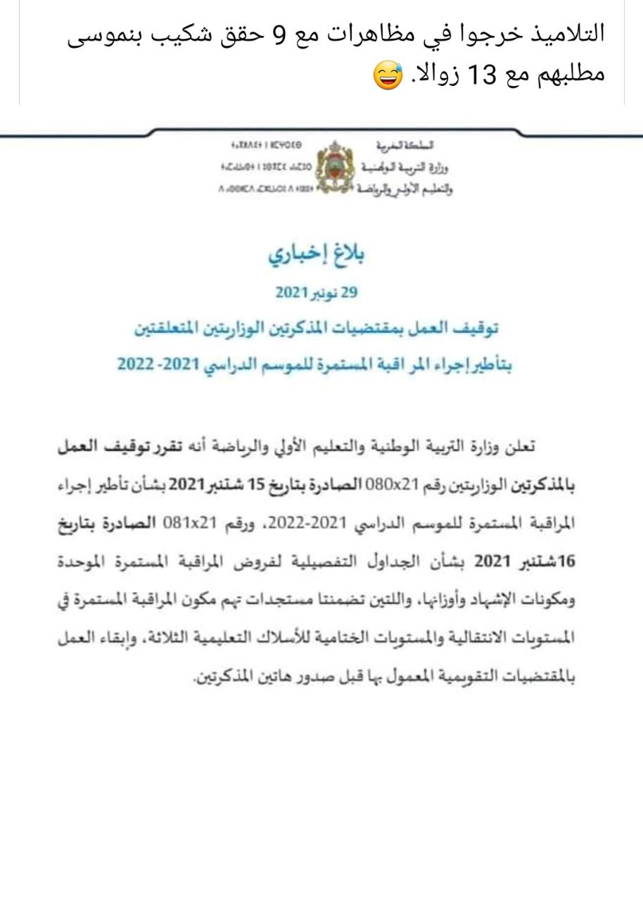 أعلنت وزارة التربية الوطنية والتعليم الأولي والرياضة، صباح اليوم الاثنين، عن قرار توقيف العمل بالمذكرتين الوزاريتين رقم080×21 الصادرة بتاريخ 15 شتنبر 2021 بشأن تأطير إجراء المراقبة المستمرة للموسم الدراسي 2021-2022، ورقم081×21 الصادرة بتاريخ 16شتنبر 2021 بشأن الجداول التفصيلية لفروض المراقبة المستمرة الموحدة ومكونات الإشهاد وأوزانها.