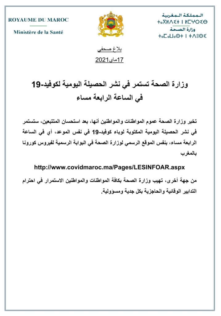 وأوضحت الوزارة، في بلاغ، أنها ستواصل نشر الحصيلة اليومية على البوابة الرسمية لفيروس كورونا بالمغرب http://www.covidmaroc.ma/Pages/LESINFOAR.aspx، وذلك بعد استحسان المتتبعين.