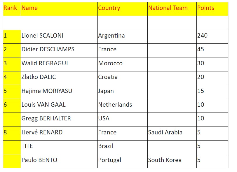 وجاء الركراكي في تصنيف الـIFFHS ثالثا بـ30 نقطة، خلف كل من مدرب فرنسا، ديديه ديشان صاحب الـ45 نقطة، والمتصدر، الأرجنتيني ليونيل سكالوني، بـ240 نقطة.
