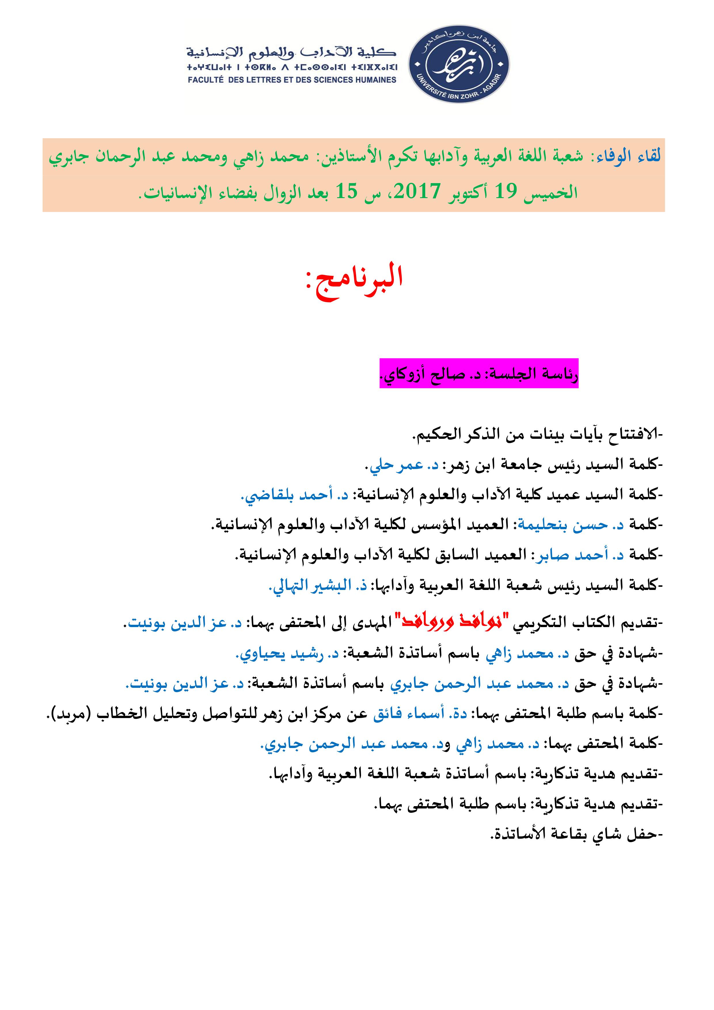 تنظم شعبة اللغة العربية وآدابها حفلا تكريميا للأستاذين محمد زاهي ومحمد عبد الرحمن جابري، تقديرا لجهودهما التربوية والأكاديمية.تجدون رفقته برنامج الحفل: