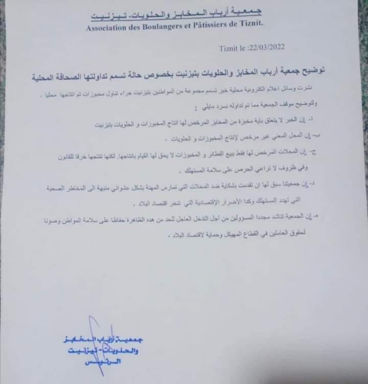 وكشفت جمعية أرباب المخابز والحلويات بتيزنيت، في بلاغ توصل ازول بريس بنسخة منه أن المحل المعني غير مرخص له لإنتاج الفطائر والحلويات لكنه يعمد إلى صنعها بشكل غير قانوني.