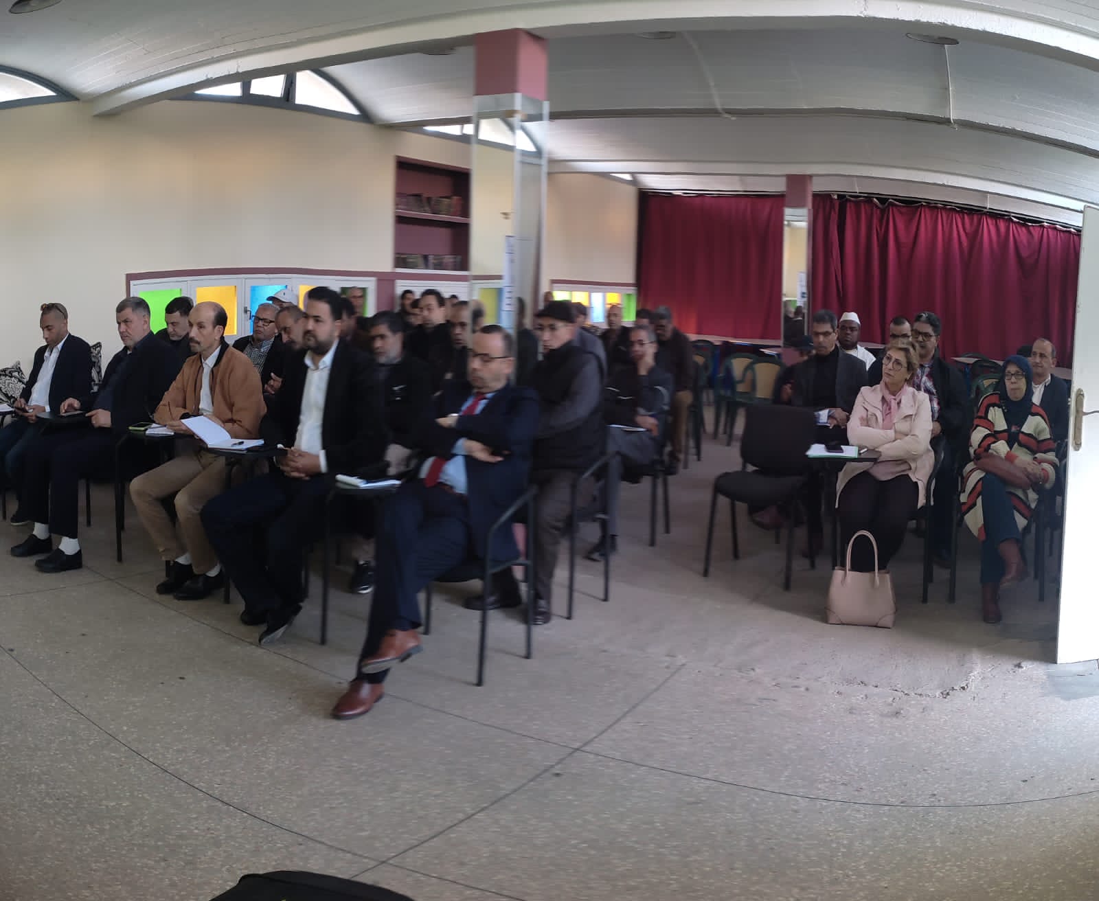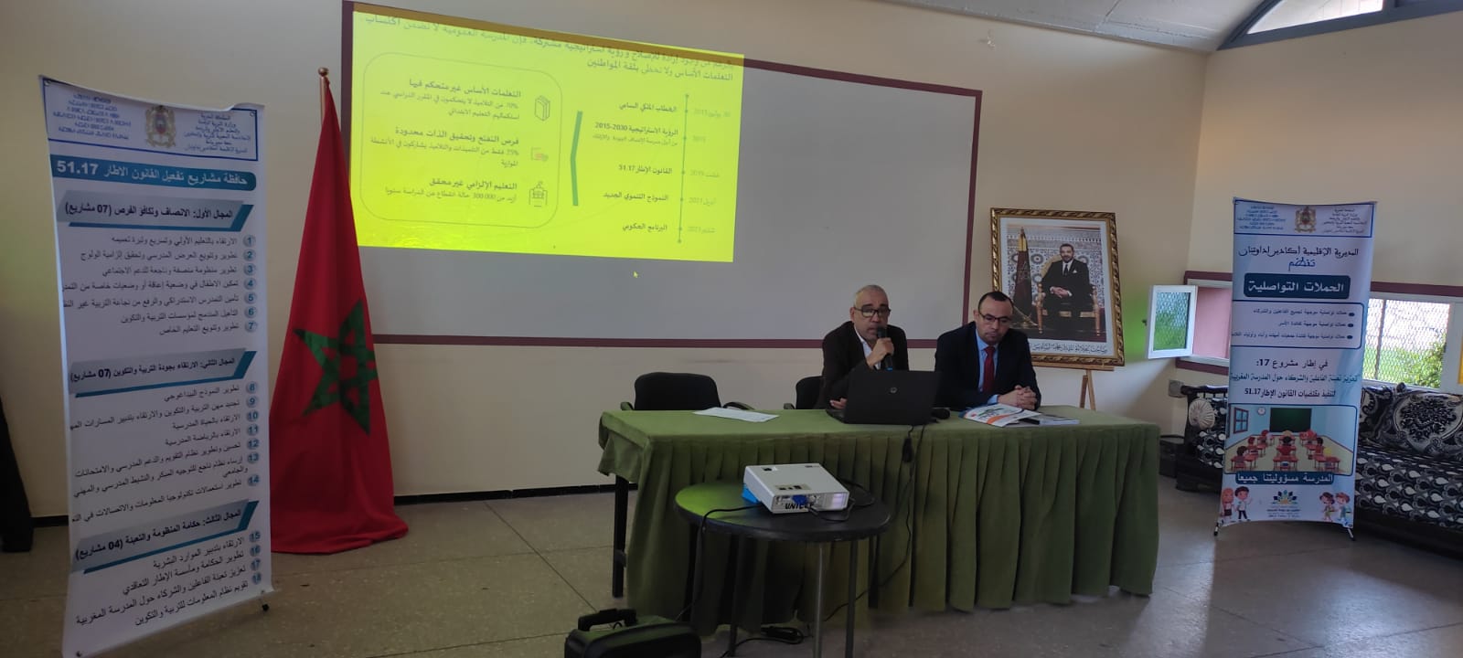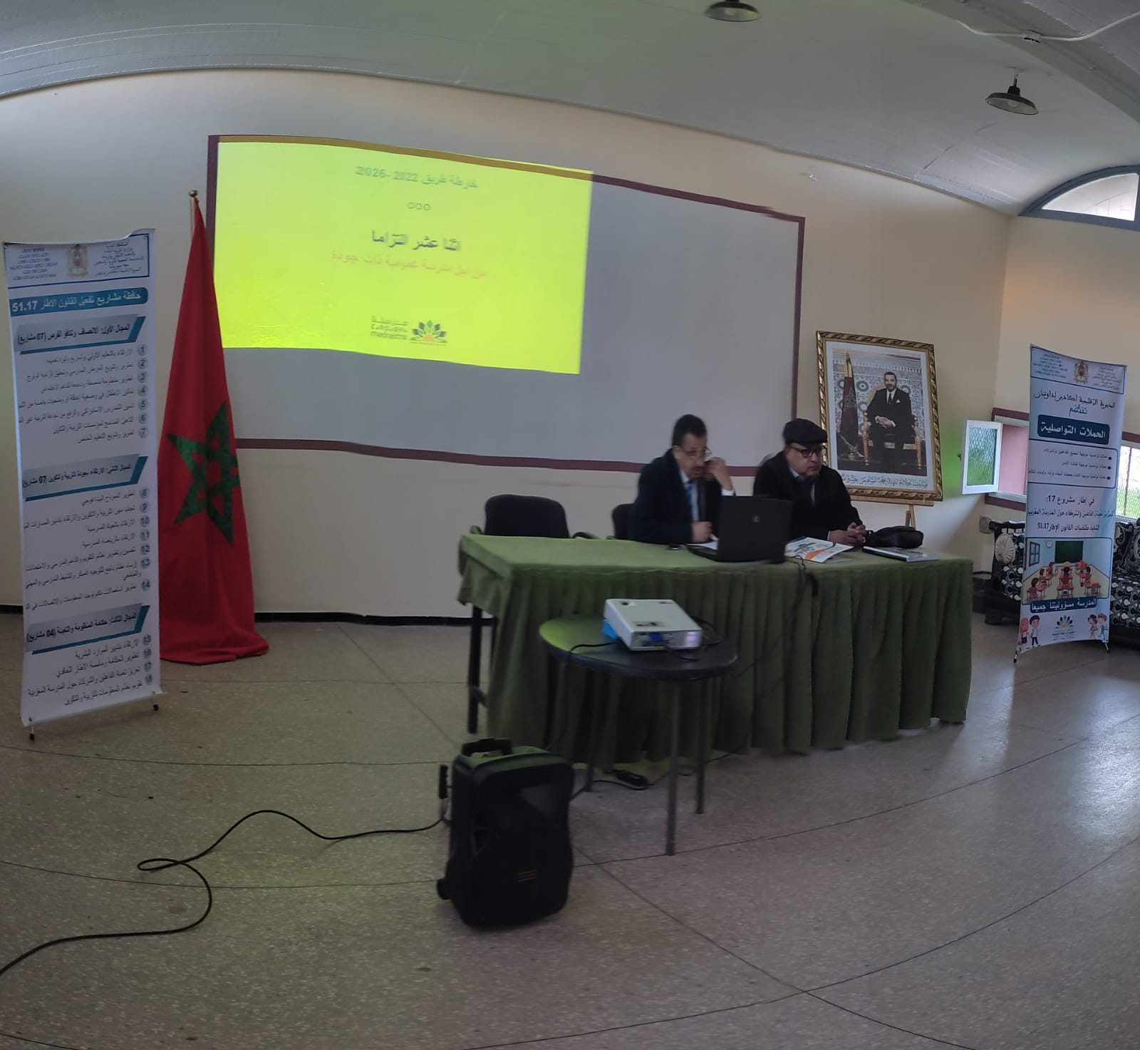 تراس السيد المدير الاقليمي صباح يوم الثلاثاء 27 دجنبر 2022 بقاعة الاجتماعات بمنتدى التعاون المدرسي اشغال اللقاء التواصلي مع السيدات والسادة رئيسات ورؤساء المؤسسات التعليمية بالوسط القروي بحضور اطر من المديرية الاقليمية حول تقاسم مضامين خارطة الطريق 2026/2022 وعرض تجربة مشروع المؤسسة المندمج لم.م. تيديلي في الشراكة في اطار ترصيد التجارب التربوية النموذجية والناجحة للشراكة التربوية.