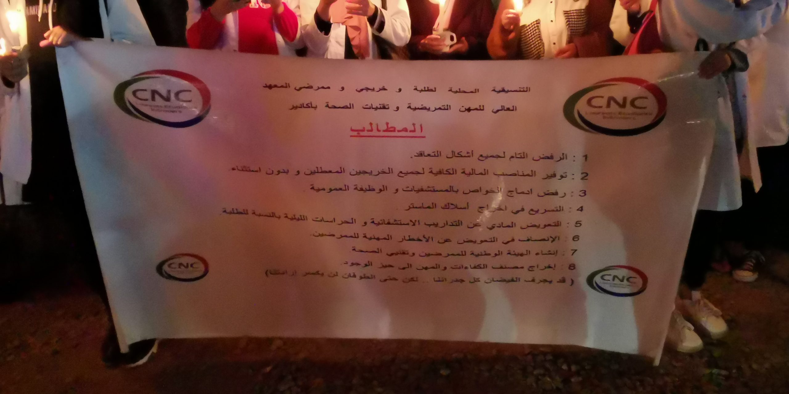 Des étudiants ainsi que des diplômés de l’Institut Supérieur des Professions Infirmières et des Techniques de Santé d’agadir ont tenu, mercredi soir, une manifestation afin de dénoncer des décisions du ministère de la Santé qu’ils jugent « injustes ».