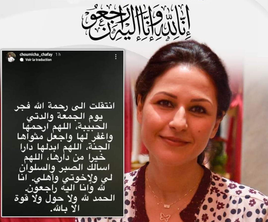 «Ma chère mère est décédée à l’aube de ce vendredi. Dieu puisse l’accueillir en son vaste Paradis. Nous sommes à Dieu et à lui nous retournons», a indiqué Choumicha sur son post. Plusieurs célébrités lui ont présenté leurs condoléances, dont Shada Hassoun, Amal Saqr, Hatim Ammor, Leila Hadioui, etc.