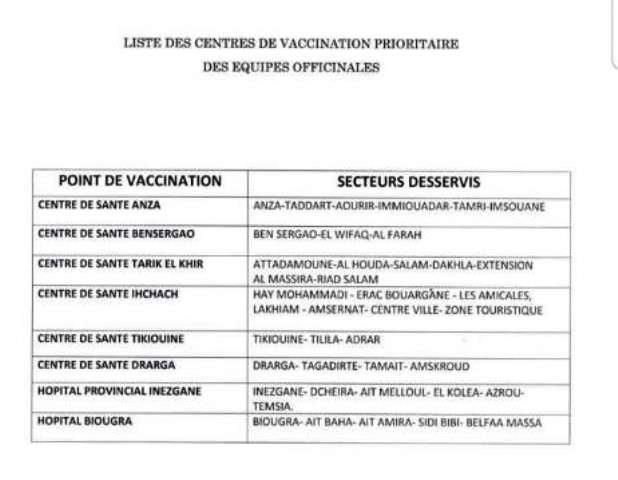 Dans le cadre des préparatifs de la campagne nationale de vaccination contre le Covid-19, le Syndicat des pharmaciens d’officine de la wilaya d’Agadir vient de publier la liste des centres de vaccination prioritaire des équipes officinales que voici :