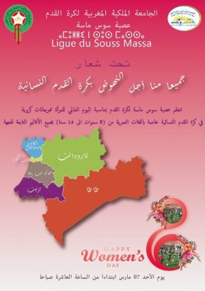 Sous le thème : « Tous pour la promotion du football féminin » et à l’occasion de la Journée Internationale de la Femme, la ligue Souss-Massa organise des festivals de football féminin réservés aux catégories d’âge de 08 à 14 ans dans toutes les préfectures et provinces de la région,et ce,le dimanche 07 mars 2021 à partir de 10 h 00.