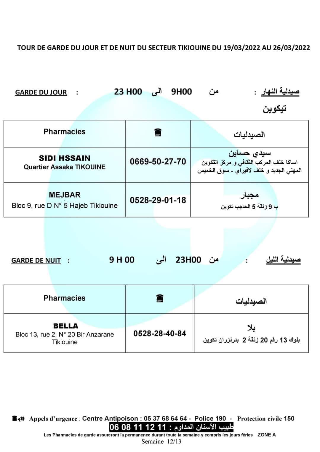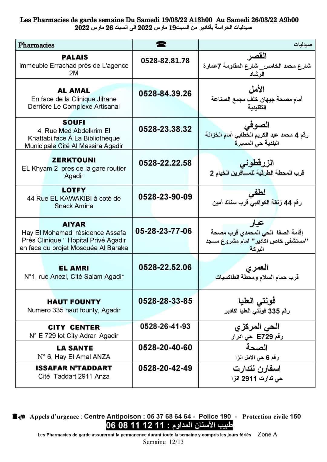 Les Pharmacies de garde semaine Du Samedi 19/03/22 Au Samedi 26/03/22