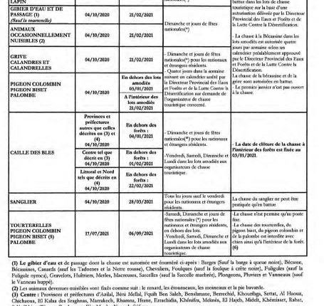 Selon l’arrêté du ministre de l’Agriculture , de la pêche maritime , du développement rural et des eaux et forêts n° 2992 en date du 20 septembre 2020 , réglementant l’ouverture et la clôture de la chasse , les jours de chasse et le nombre de gibiers autorisés pour la saison 2020/2021,la saison de chasse sera ouverte demain,dimanche 4 octobre 2020 pour les principales espèces de gibier .